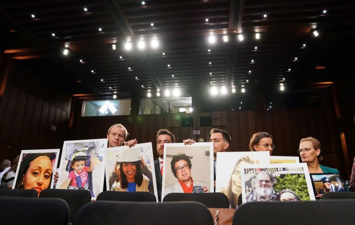 Family members hold photographs of crash victims lost in two deadly Boeing 737 Max crashes that killed 346 people as Boeing CEO Dennis Muilenburg testifies before a Senate Commerce, Science and Transportation Committee hearing on aviation safety and the grounded 737 Max, on Capitol Hill in Washington, Oct. 29, 2019.
